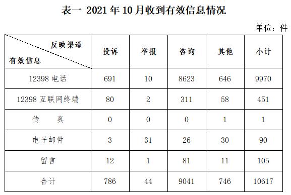 2021年10月,國家能源局12398能源監(jiān)管熱線(以下簡(jiǎn)稱12398熱線)共收到有效信息10617件(包含投訴、舉報(bào)、咨詢和其他訴求類別),環(huán)比減少13.63%,同比增加26.03%。(2021年10月收到有效信息情況見表一)