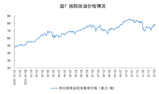 原油進(jìn)口由降轉(zhuǎn)增,國際原油價格上漲。12月份,進(jìn)口原油4614萬噸,同比增長19.9%,上月為下降8.0%;2021年,進(jìn)口原油51298萬噸,比上年下降5.4%。12月31日,布倫特原油現(xiàn)貨離岸價格為77.24美元/桶,比11月30日的70.86美元/桶上漲9.0%。