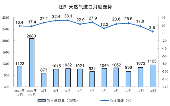 天然氣進(jìn)口增速回落。12月份,進(jìn)口天然氣1165萬噸,同比增長3.8%,增速比上月回落14.0個百分點。2021年,進(jìn)口天然氣12136萬噸,比上年增長19.9%。