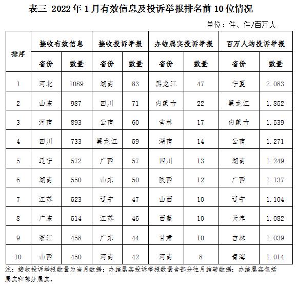 各省(自治區(qū)、直轄市)按照接收的有效信息數(shù)量排序,河北、山東、河南、四川、遼寧、湖南、江蘇、廣東、浙江、山西排在全國前10位;按照接收的投訴舉報(bào)數(shù)量排序,湖南、四川、云南、黑龍江、廣西、山東、遼寧、江蘇、廣東、河南排在全國前10位;按照辦結(jié)屬實(shí)的投訴舉報(bào)數(shù)量排序,黑龍江、內(nèi)蒙古、吉林、湖南、四川、陜西、山西、西藏、甘肅、河南排在全國前10位;按照百萬人均投訴舉報(bào)數(shù)量排序,寧夏、黑龍江、內(nèi)蒙古、云南、湖南、廣西、遼寧、天津、吉林、青海排在全國前10位。(2022年1月有效信息及投訴舉報(bào)排名前10位情況見表三)