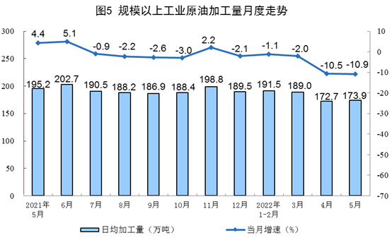 原油加工量繼續(xù)下降。5月份,加工原油5392萬噸,同比下降10.9%,降幅比上月擴(kuò)大0.4個(gè)百分點(diǎn),日均加工173.9萬噸。1—5月份,加工原油27716萬噸,同比下降5.3%。