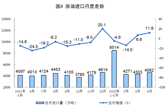1—5月份,生產(chǎn)原油8569萬噸,同比增長(zhǎng)4.1%。進(jìn)口原油21671萬噸,同比下降1.7%。