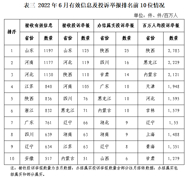 各省(自治區(qū)、直轄市)按照接收的有效信息數(shù)量排序,山東、河南、河北、江蘇、陜西、浙江、廣東、四川、遼寧、安徽排在全國(guó)前10位;按照接收的投訴舉報(bào)數(shù)量排序,山東、河北、陜西、河南、四川、黑龍江、遼寧、湖南、江蘇、內(nèi)蒙古排在全國(guó)前10位;按照辦結(jié)屬實(shí)的投訴舉報(bào)數(shù)量排序,陜西、四川、甘肅、廣東、黑龍江、內(nèi)蒙古、湖北、湖南、遼寧、山西排在全國(guó)前10位;按照百萬(wàn)人均投訴舉報(bào)數(shù)量排序,陜西、黑龍江、內(nèi)蒙古、天津、河北、吉林、遼寧、上海、青海、甘肅排在全國(guó)前10位。(2022年6月有效信息及投訴舉報(bào)排名前10位情況見表三)