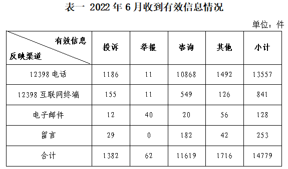 2022年6月,國(guó)家能源局12398能源監(jiān)管熱線(以下簡(jiǎn)稱12398熱線)共收到有效信息14779件(包含投訴、舉報(bào)、咨詢和其他訴求類別),環(huán)比增加43.12%,同比增加49.28%。(2022年6月收到有效信息情況見表一)