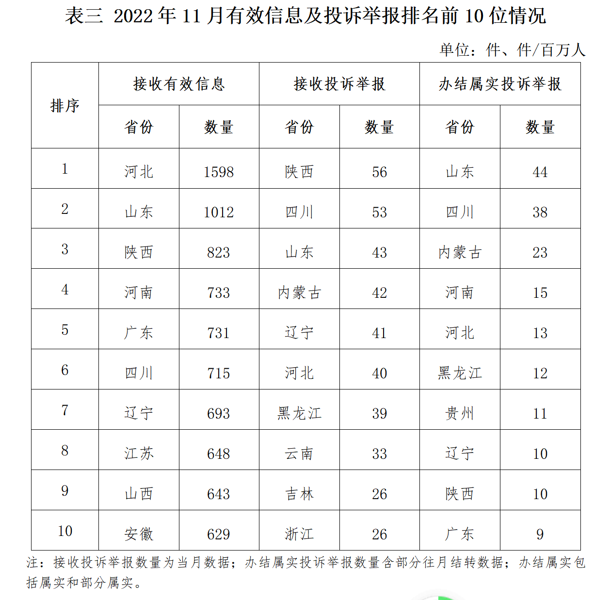 各省(自治區(qū)、直轄市)按照接收的有效信息數(shù)量排序,河北、山東、陜西、河南、廣東、四川、遼寧、江蘇、山西、安徽排在全國前10位;按照接收的投訴舉報數(shù)量排序,陜西、四川、山東、內(nèi)蒙古、遼寧、河北、黑龍江、云南、吉林、浙江排在全國前10位;按照辦結屬實的投訴舉報數(shù)量排序,山東、四川、內(nèi)蒙古、河南、河北、黑龍江、貴州、遼寧、陜西、廣東古排在全國前10位。(2022年11月有效信息及投訴舉報排名前10位情況見表三)