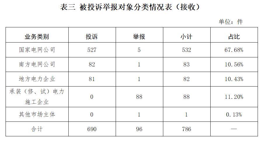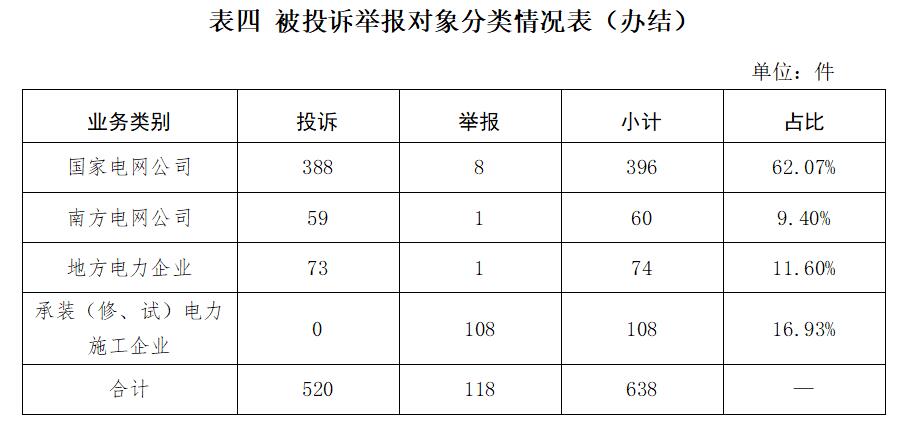 從被投訴舉報(bào)對(duì)象看,供電企業(yè)530件、占投訴舉報(bào)總數(shù)的83.07%,其中國(guó)家電網(wǎng)公司396件、占投訴舉報(bào)總數(shù)的62.07%,南方電網(wǎng)公司60件、占投訴舉報(bào)總數(shù)的9.40%,地方電力企業(yè)74件、占投訴舉報(bào)總數(shù)的11.60%;承裝(修、試)電力施工企業(yè)108件、占投訴舉報(bào)總數(shù)的16.93%。