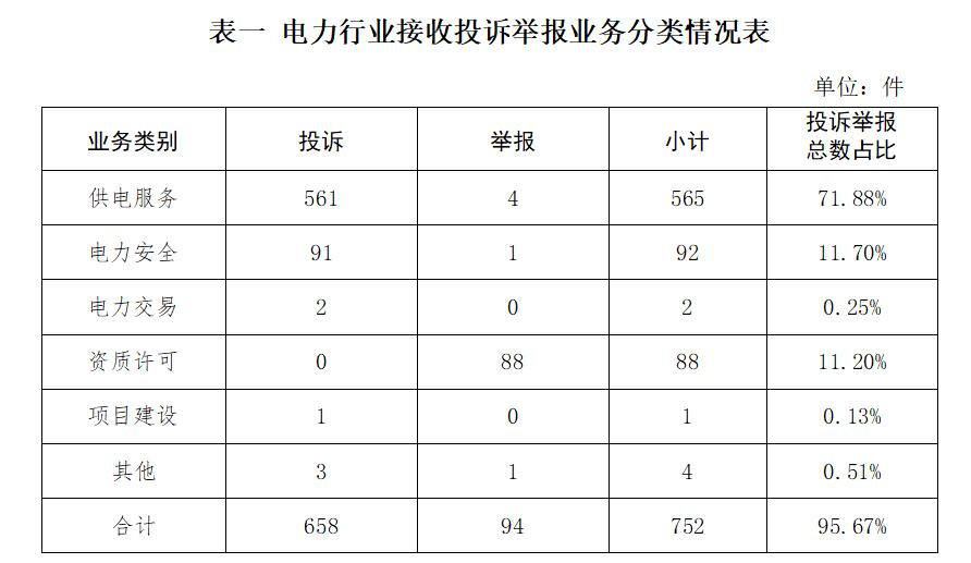 電力行業(yè)排在首位,數(shù)量為752件、占投訴舉報(bào)總數(shù)的95.67%,主要集中在供電服務(wù)、電力安全、資質(zhì)許可等方面。