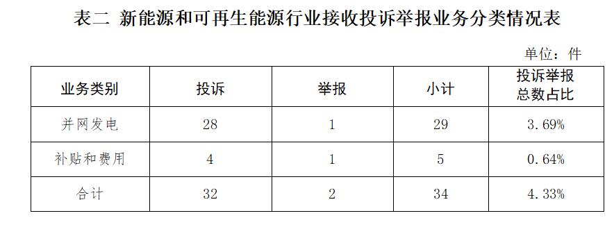 新能源和可再生能源行業(yè)排在第二位,數(shù)量為34件、占投訴舉報(bào)總數(shù)的4.33%,主要集中在并網(wǎng)發(fā)電、補(bǔ)貼和費(fèi)用等方面。