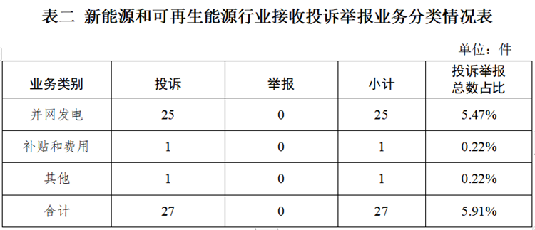 新能源和可再生能源行業(yè)排在第二位,數(shù)量為27件、占投訴舉報總數(shù)的5.91%,主要集中在并網(wǎng)發(fā)電方面。