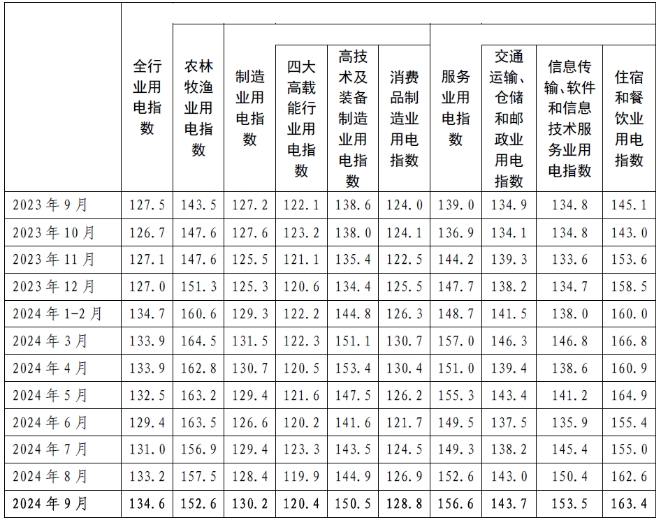 2024年9月,全行業(yè)用電指數(shù)為134.6,全行業(yè)用電量比2020年基期增長了34.6%,年均增長7.7%,同比增長5.6%,全行業(yè)用電量保持平穩(wěn)增長。