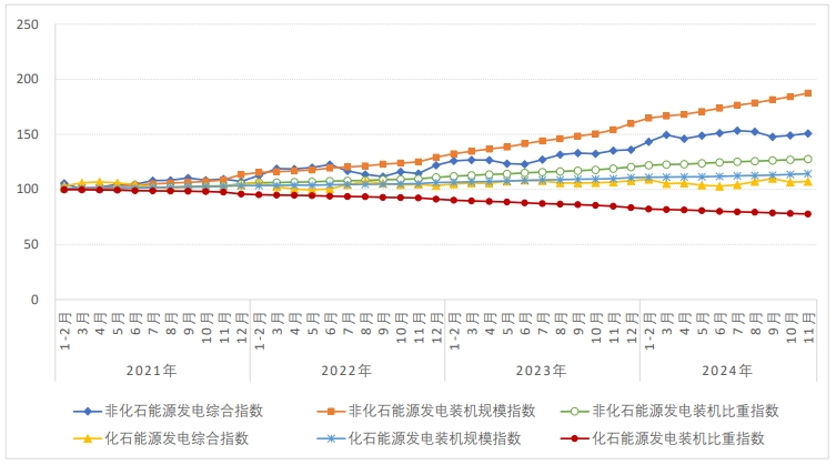 11月,非化石能源發(fā)電裝機規(guī)模指數(shù)為187.4,“十四五”以來非化石能源發(fā)電裝機規(guī)模累計增長了87.4%,同比增長21.6%。非化石能源發(fā)電裝機比重指數(shù)為127.5,“十四五”以來非化石能源發(fā)電裝機比重累計提升了27.5%(比重從2020年底的44.8%提高至2024年11月底的57.1%)。