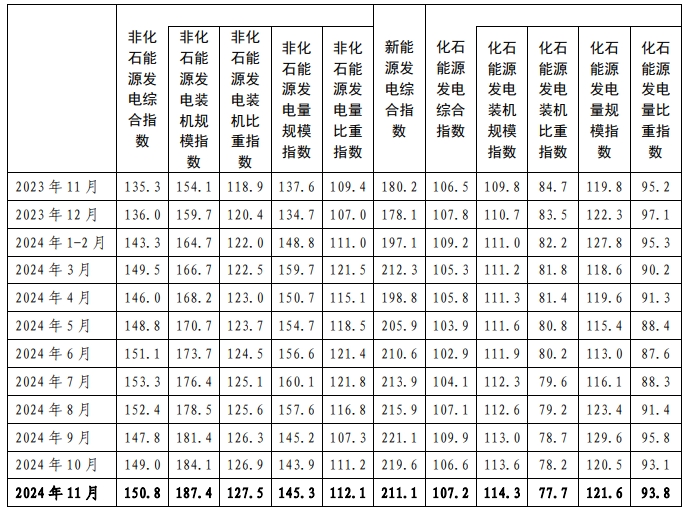 2024年11月,非化石能源發(fā)電綜合指數(shù)為150.8,比2020年基期增長了50.8%,同比增長11.5%;其中,新能源發(fā)電綜合指數(shù)為211.1,比2020年基期增長了111.1%,同比增長17.1%。在“雙碳”目標引領下,非化石能源及其新能源發(fā)電綜合指數(shù)保持快速增長態(tài)勢。其中: