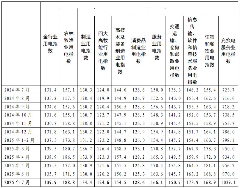 2025年7月,全國(guó)全行業(yè)用電指數(shù)為139.9,全行業(yè)用電量比2020年基期(以2020年基期為100)增長(zhǎng)了39.9%,年均增長(zhǎng)6.9%,同比增長(zhǎng)6.5%,增速比上月提高1.9個(gè)百分點(diǎn)。