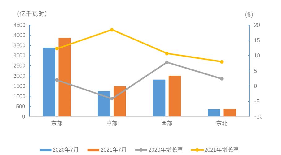 7月份,東、中、西部和東北地區(qū)全社會用電量增速分別為12.3%、18.5%、10.7%和8.0%。