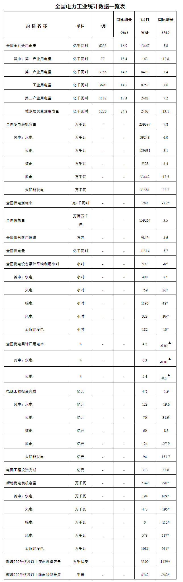 注:1.全社會用電量為全口徑數(shù)據(jù),全國供電量為調(diào)度口徑數(shù)據(jù)。2.“同比增長”列中,標(biāo)*的指標(biāo)為絕對量;標(biāo)▲的指標(biāo)為百分點。
