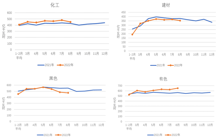 8月份,化工行業(yè)用電量452億千瓦時(shí),同比增長2.7%;建材行業(yè)用電量354億千瓦時(shí),同比下降6.7%;黑色金屬冶煉行業(yè)用電量474億千瓦時(shí),同比下降15.0%;有色金屬冶煉行業(yè)用電量652億千瓦時(shí),同比增長7.1%。