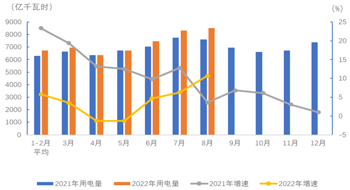 圖1 2021、2022年分月全社會(huì)用電量及其增速