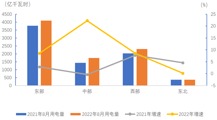 8月份,東、中、西部和東北地區(qū)全社會(huì)用電量增速分別為8.6%、22.3%、8.6%和0.2%。