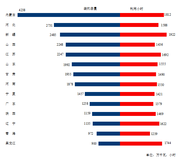 圖3 1-9月份風電裝機較多省份風電裝機容量和設備利用小時
