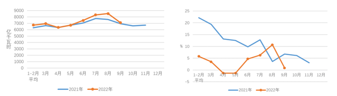 圖1 2021、2022年分月全社會用電量及其增速