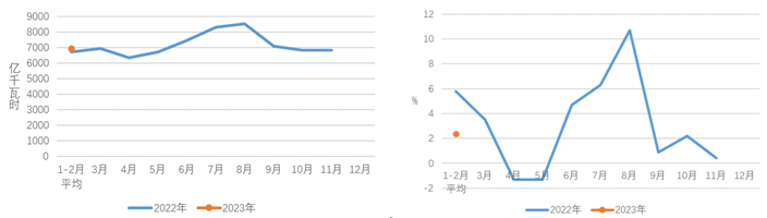 圖1 2022、2023年分月全社會(huì)用電量及其增速