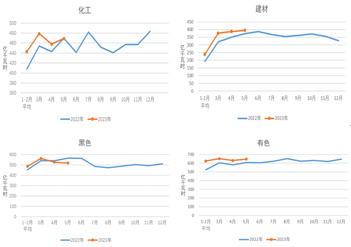 1-5月,化工行業(yè)用電量2297億千瓦時(shí),同比增長3.2%;建材行業(yè)用電量1646億千瓦時(shí),同比增長8.1%;黑色金屬冶煉行業(yè)用電量2580億千瓦時(shí),同比下降0.9%;有色金屬冶煉行業(yè)用電量3182億千瓦時(shí),同比增長3.7%。