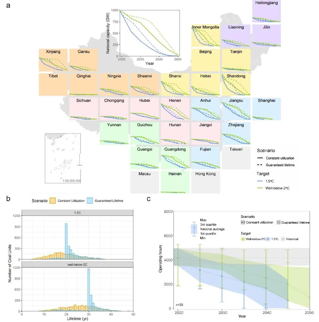 圖2煤電機(jī)組退出路徑以及兩種退役情景下對煤電機(jī)組運(yùn)行年限和利用小時(shí)的影響。在1.5°C和2°C目標(biāo)和兩種電廠退役情景下(a)國家級及省級煤電機(jī)組退出路徑圖;(b)煤電機(jī)組運(yùn)行年限直方圖分布;(c)煤電機(jī)組利用小時(shí)數(shù)變化曲線