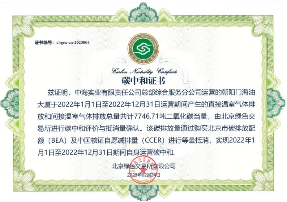 北京綠色交易所按照制定碳中和計劃、實施減排行動、碳排放核算、北京碳配額及CCER等量抵消,“碳中和”評價和聲明等全流程要求,支持中國海油總部大樓實現(xiàn)年度自身運營“碳中和”目標(biāo),并頒發(fā)“碳中和”證書。