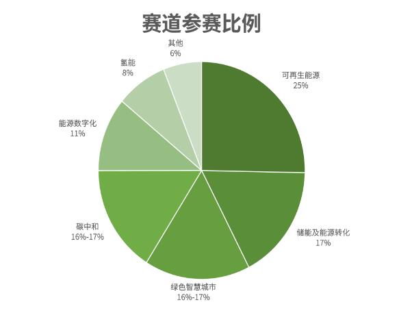 在全球轉(zhuǎn)型非化石能源,以及氣候行動(dòng)加速的大趨勢(shì)下,可再生能源賽道是今年大賽的最熱門賽道,項(xiàng)目占比25%,緊隨其后的是儲(chǔ)能及能源轉(zhuǎn)化賽道,占比17%。城市是人類應(yīng)對(duì)氣候變化最重要的陣地,今年大賽新增綠色智慧城市賽道也受到廣泛關(guān)注,與碳中和賽道勢(shì)均力敵,兩個(gè)賽道占比均在16%-17%之間,能源數(shù)字化賽道占比11%,氫能賽道占比8%。其他創(chuàng)新項(xiàng)目占比6%。