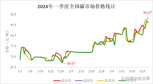 根據(jù)下圖可知,2024年一季度全國(guó)碳市場(chǎng)價(jià)格呈現(xiàn)一個(gè)波動(dòng)上漲的趨勢(shì),其中最高價(jià)出現(xiàn)在3月29日,最低價(jià)出現(xiàn)在1月30日,僅69.67元/噸。而平均最高價(jià)為78.22元/噸,最低平均價(jià)為77.13元/噸,平均開盤價(jià)為77.73元/噸,平均收盤價(jià)為77.42元/噸。