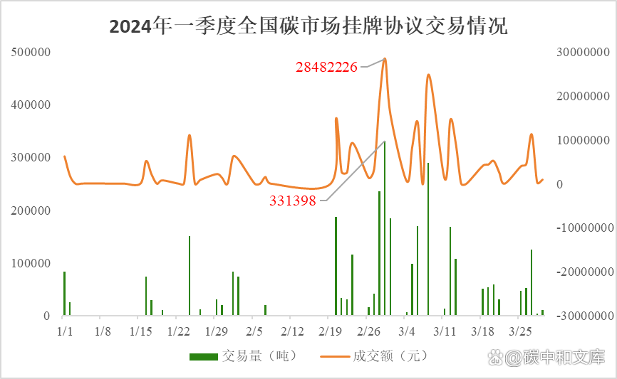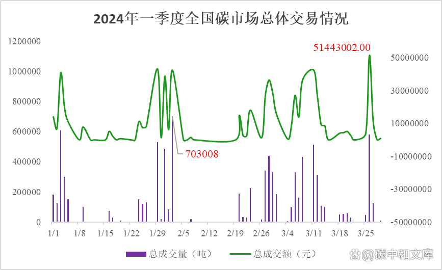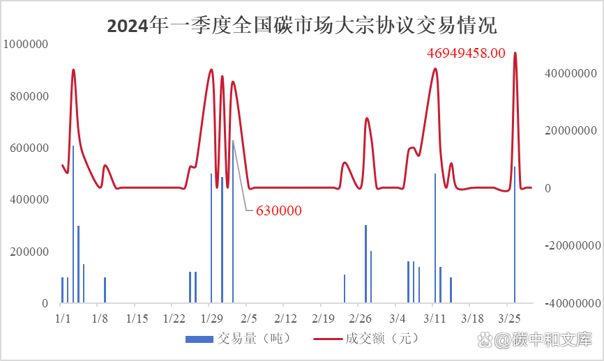 具體交易情況如下圖所示:2024年一季度碳市場(chǎng)掛牌協(xié)議交易碳配額總計(jì)3067072噸,交易金額達(dá)到了252341511.54元,交易均價(jià)為82.27元/噸。其中2024年2月29日交易量和交易金額最多,分別為331398噸和28482226元。大宗協(xié)議交易碳配額總計(jì)5548187噸,交易金額達(dá)到了420928187.9元,交易均價(jià)為75.87元/噸。其中2024年2月2日交易量最多達(dá)到了630000噸,2024年3月8日交易金額最大為46949458元。