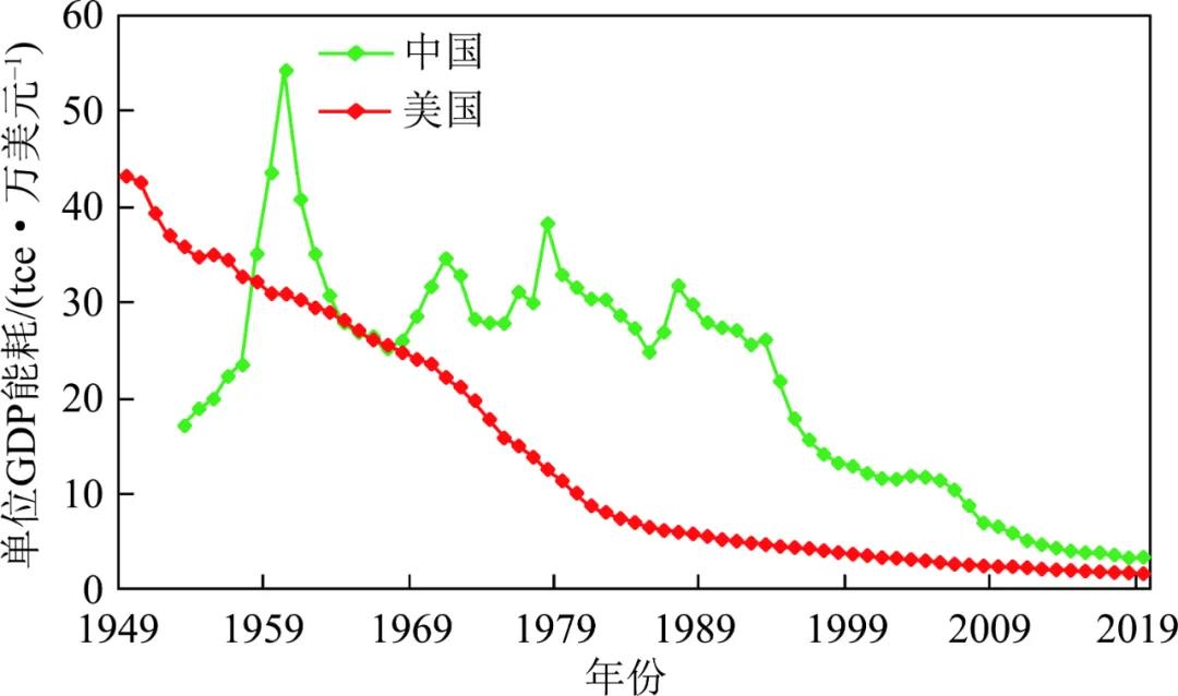 美國能源消費(fèi)碳排放強(qiáng)度在碳達(dá)峰前期、達(dá)峰期下降幅度較小,實(shí)現(xiàn)碳達(dá)峰核心是提高能源效率,降低單位GDP能耗,在不大幅度增加能源消費(fèi)的前提下,支撐經(jīng)濟(jì)增長。2019年美國單位GDP能耗僅相當(dāng)于1949年的3.9%。