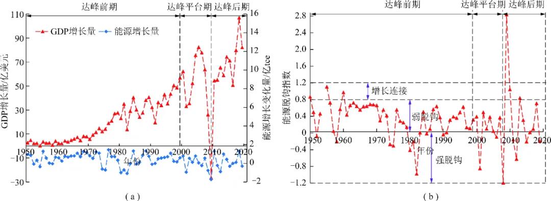 研究人員根據(jù)現(xiàn)代化進(jìn)程、能源消費(fèi)和碳排放趨勢(shì),將美國碳排放分三個(gè)階段:即碳達(dá)峰前期(1949—1999年)、碳達(dá)峰平臺(tái)期(2000—2008年)、碳達(dá)峰后期(2009年至今)。依據(jù)Tapio彈性分析法對(duì)美國能源消耗與GDP增長的脫鉤程度進(jìn)行定量分析后,得到如下認(rèn)識(shí):