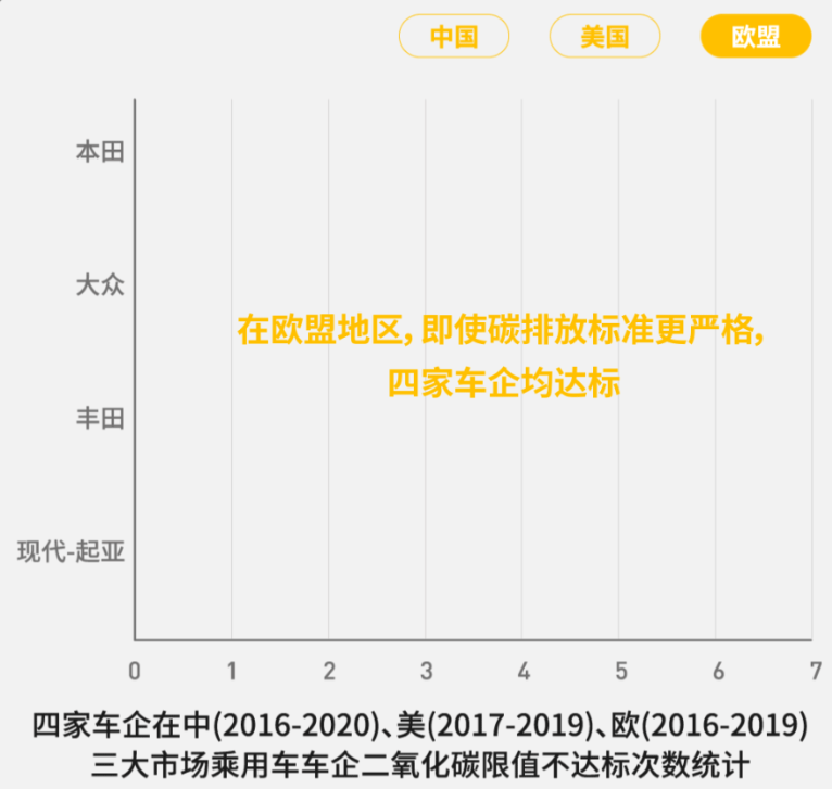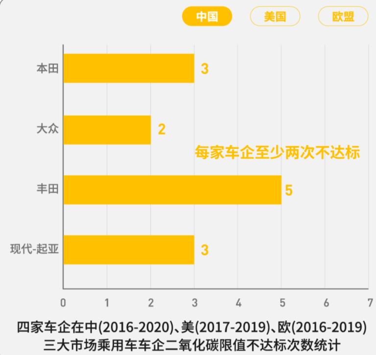 報(bào)告數(shù)據(jù)顯示,2016-2020年間,四家車企在中國(guó)均至少有兩次不達(dá)標(biāo),其中豐田五次不達(dá)標(biāo),本田與現(xiàn)代-起亞三次不達(dá)標(biāo),大眾則有兩次。