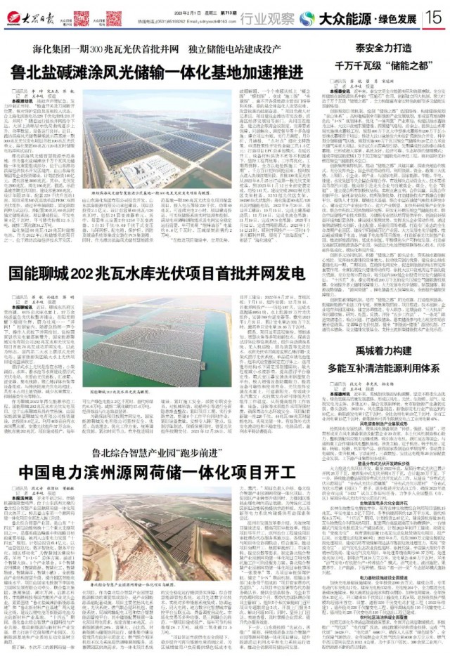 濰坊濱海風光儲智慧能源示范基地,作為魯北鹽堿灘涂千萬千瓦風光儲輸一體化重要組成部分,位于山東濰坊濱海經(jīng)濟技術開發(fā)區(qū)境內,由山東?;瘓F等企業(yè)投資建設,計劃總投資140億元,裝機容量3000兆瓦。其中,光伏發(fā)電2900兆瓦,風電100兆瓦。據(jù)悉,示范基地首期光伏項目,建設容量300兆瓦,設計年限25年,配套220千伏升壓站1座。項目采用540瓦高效單晶PERC雙面光伏組件,通過平單軸跟蹤、固定跟蹤兩種方式運行,并配置30兆瓦/60兆瓦時獨立儲能系統(tǒng)。項目建成投運,年發(fā)電量4億千瓦時,年可替代標煤12.5萬噸,減排二氧化碳34.2萬噸。