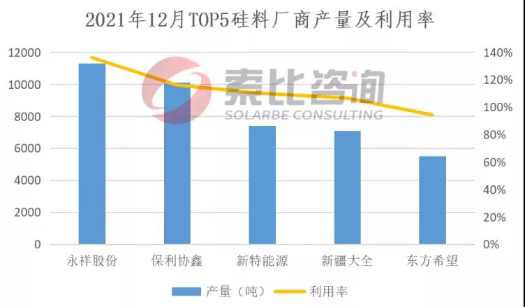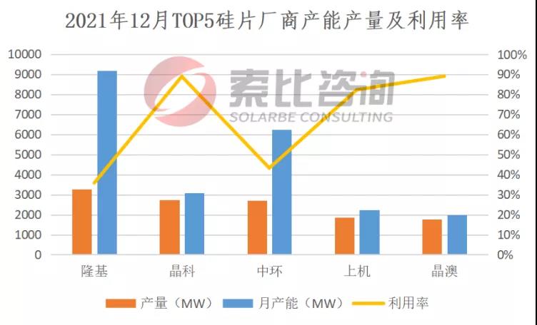 根據(jù)索比咨詢統(tǒng)計(jì),2021年12月,前五大硅料企業(yè)總產(chǎn)量4.14萬噸,綜合產(chǎn)能利用率112.6%。硅片方面,兩家頭部企業(yè)開工率回至50%以上,一體化企業(yè)開工率相對(duì)較高。去年12月,國內(nèi)硅片產(chǎn)量17.85GW,環(huán)比下降8.6%。按照產(chǎn)量排名,隆基、晶科、中環(huán)、上機(jī)、晶澳位列前五,總產(chǎn)量12.35GW,占比69.19%,綜合利用率67.81%。雖然有觀點(diǎn)認(rèn)為,中環(huán)的實(shí)際產(chǎn)能利用率要高于上述數(shù)據(jù),但總體看,產(chǎn)業(yè)鏈上游價(jià)格居高不下,已經(jīng)影響到終端需求,并反作用于上游。