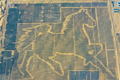 在庫布齊沙漠,國家電投內(nèi)蒙古公司用196320塊光伏板拼成的巨型光伏電站,該項目占地1398421平方米,充分利用與周圍低矮植被、黃沙間的色差形成了駿馬圖騰。