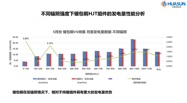 王文靜博士介紹,華晟的異質(zhì)結(jié)技術(shù)已經(jīng)發(fā)展至3.0階段,實(shí)現(xiàn)了雙面微晶異質(zhì)結(jié)電池的量產(chǎn),并通過銀包銅、0BB、電鍍銅等工藝,在保障產(chǎn)品可靠性的同時(shí)持續(xù)推動(dòng)異質(zhì)結(jié)降本。去年下半年,公司已在異質(zhì)結(jié)電池的背面副柵中導(dǎo)入了銀包銅漿料,從測(cè)試數(shù)據(jù)來看,銀包銅組件較純銀組件仍有超1%的發(fā)電量增益,且這一發(fā)電量?jī)?yōu)勢(shì)在高溫與低輻照環(huán)境下更加明顯。
