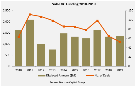 2019年太陽能行業(yè)的全球風(fēng)險(xiǎn)投資和私募股權(quán)融資(VC / PE)共計(jì)53筆交易,達(dá)到14億美元,而2018年的65筆交易為13億美元。