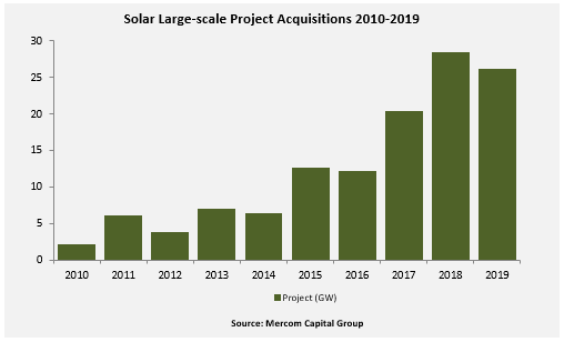 2019年,共有26吉瓦的大型太陽能項(xiàng)目易手,而2018年為29吉瓦。2019年有192個(gè)大型太陽能項(xiàng)目并購,而2018年為218個(gè)大型太陽能項(xiàng)目。