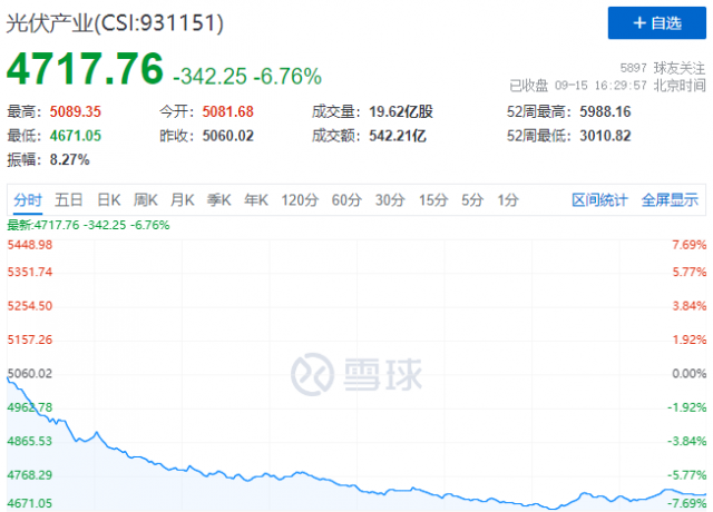 9月15日,受歐盟委員會擬推行“涉J法案”等利空消息影響,光伏板塊全線暴跌,中證光伏產(chǎn)業(yè)指數(shù)(CSI:931151)報收4718點,跌幅達到6.67%,自8月18日高點以來,累計跌幅達到18.6%。