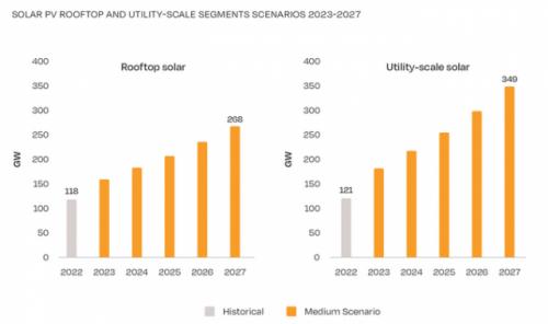 歐洲光伏產(chǎn)業(yè)協(xié)會預(yù)測,到2023年,全球安裝的屋頂光伏系統(tǒng)裝機(jī)容量將增長35%,預(yù)計增加到159GW。根據(jù)中期情景,到2024年,這一數(shù)字可能上升到183GW,到2027年可能達(dá)到268GW。與2022年相比,這一增長將更加穩(wěn)定,因?yàn)檫@將受到能源價格回歸較低水平的推動。