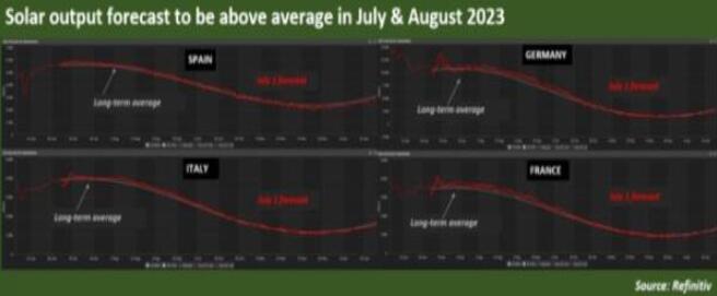 Refinitiv(路孚特,倫敦證券交易所集團旗下企業(yè),是全球最大的金融市場數據和基礎設施提供商之一)對國家級太陽能產量的預測顯示,西班牙、德國、法國和意大利的產量將遠高于長期平均水平——所有主要太陽能生產國最近幾周都經歷了持續(xù)炎熱的天氣。