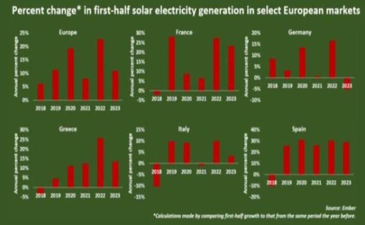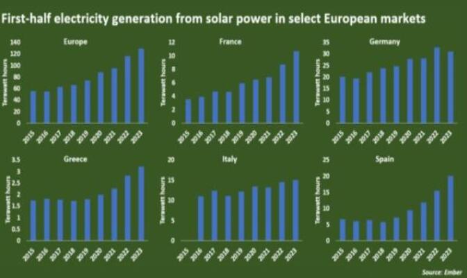 據 Ember(Ember是一個獨立能源智庫,旨在通過數據和分析,推動世界向清潔電力轉型。) 稱,今年上半年歐洲太陽能發(fā)電量較 2022年同期,增長了近 11%,達到創(chuàng)紀錄的 129.2 太瓦時。