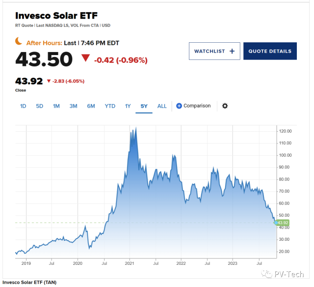 上周五(10月20日),Invesco Solar ETF(TAN)暴跌6.57%,最新交易價(jià)為44.18美元,創(chuàng)下2020年7月以來(lái)的最低水平。由于前景悲觀,太陽(yáng)能行業(yè)股票普遍下跌。