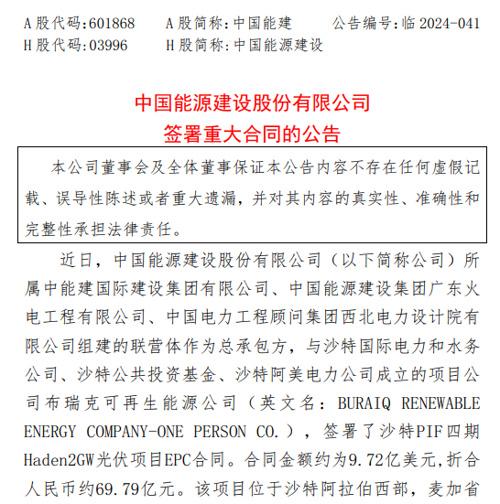 8月13日晚間,中國(guó)能建公告稱,公司簽署了沙特PIF四期Haden2GW光伏項(xiàng)目(以下簡(jiǎn)稱沙特2GW光伏項(xiàng)目)EPC合同,金額約為9.72億美元(約合人民幣70億元)。