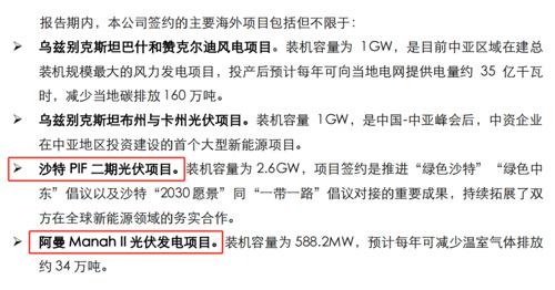 中國(guó)能建2023年度社會(huì)責(zé)任(ESG)報(bào)告顯示,報(bào)告期內(nèi),公司簽訂的海外項(xiàng)目包含:沙特PIF二期光伏項(xiàng)目、阿曼Manah II光伏發(fā)電項(xiàng)目。