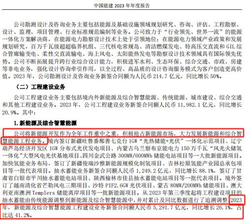目前,中國(guó)能建正在積極搶占新能源市場(chǎng),大力發(fā)展新能源和綜合智慧能源工程業(yè)務(wù)。2023年,公司新能源及綜合智慧能源工程建設(shè)業(yè)務(wù)新簽合同金額為5291.7億元,同比增長(zhǎng)26.1%,占比達(dá)41.2%。