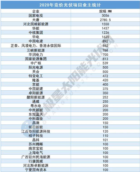 (2020年競(jìng)價(jià)光伏項(xiàng)目規(guī)模超100MW業(yè)主)