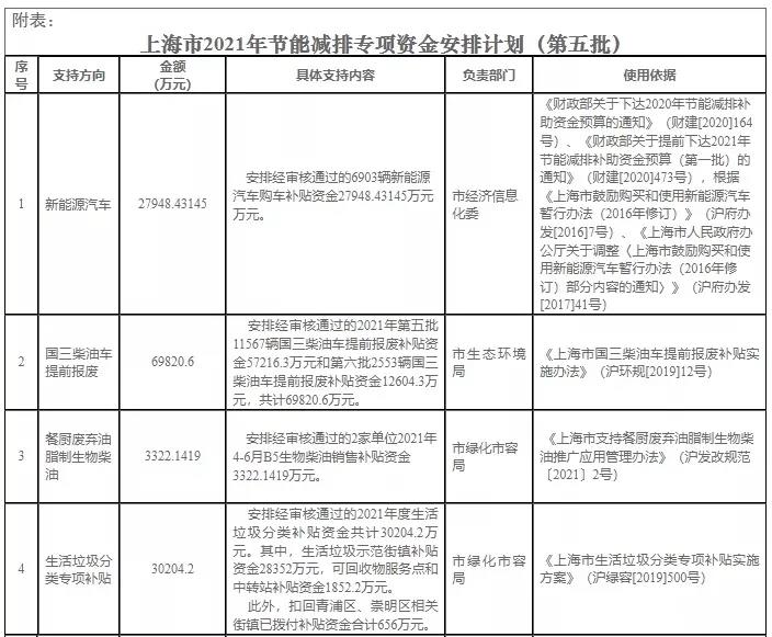 1、按照《財(cái)政部關(guān)于下達(dá)2020年節(jié)能減排補(bǔ)助資金預(yù)算的通知》(財(cái)建[2020]164號)、《財(cái)政部關(guān)于提前下達(dá)2021年節(jié)能減排補(bǔ)助資金預(yù)算(第一批)的通知》(財(cái)建[2020]473號),根據(jù)《上海市鼓勵(lì)購買和使用新能源汽車暫行辦法(2016年修訂)》(滬府辦發(fā)[2016]7號)、《上海市人民政府辦公廳關(guān)于調(diào)整〈上海市鼓勵(lì)購買和使用新能源汽車暫行辦法(2016年修訂)部分內(nèi)容的通知〉》(滬府辦發(fā)[2017]41號)等規(guī)定,安排經(jīng)審核通過的6903輛新能源汽車購車補(bǔ)貼資金27948.43145萬元。